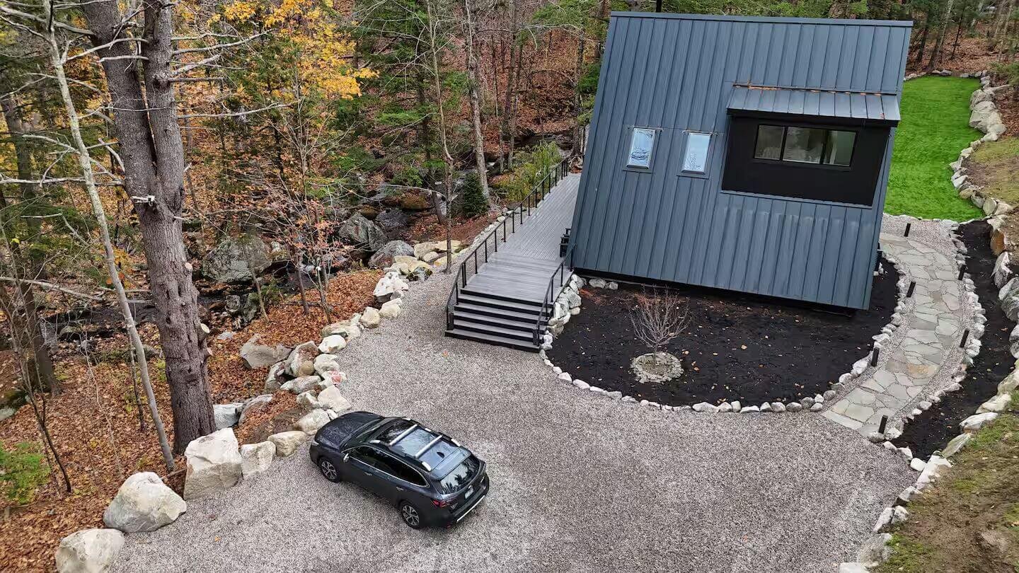 The property is located in a natural forest setting beside a flowing brook. Guests are encouraged to exercise caution when exploring the outdoor areas, especially near the stream or uneven terrain.