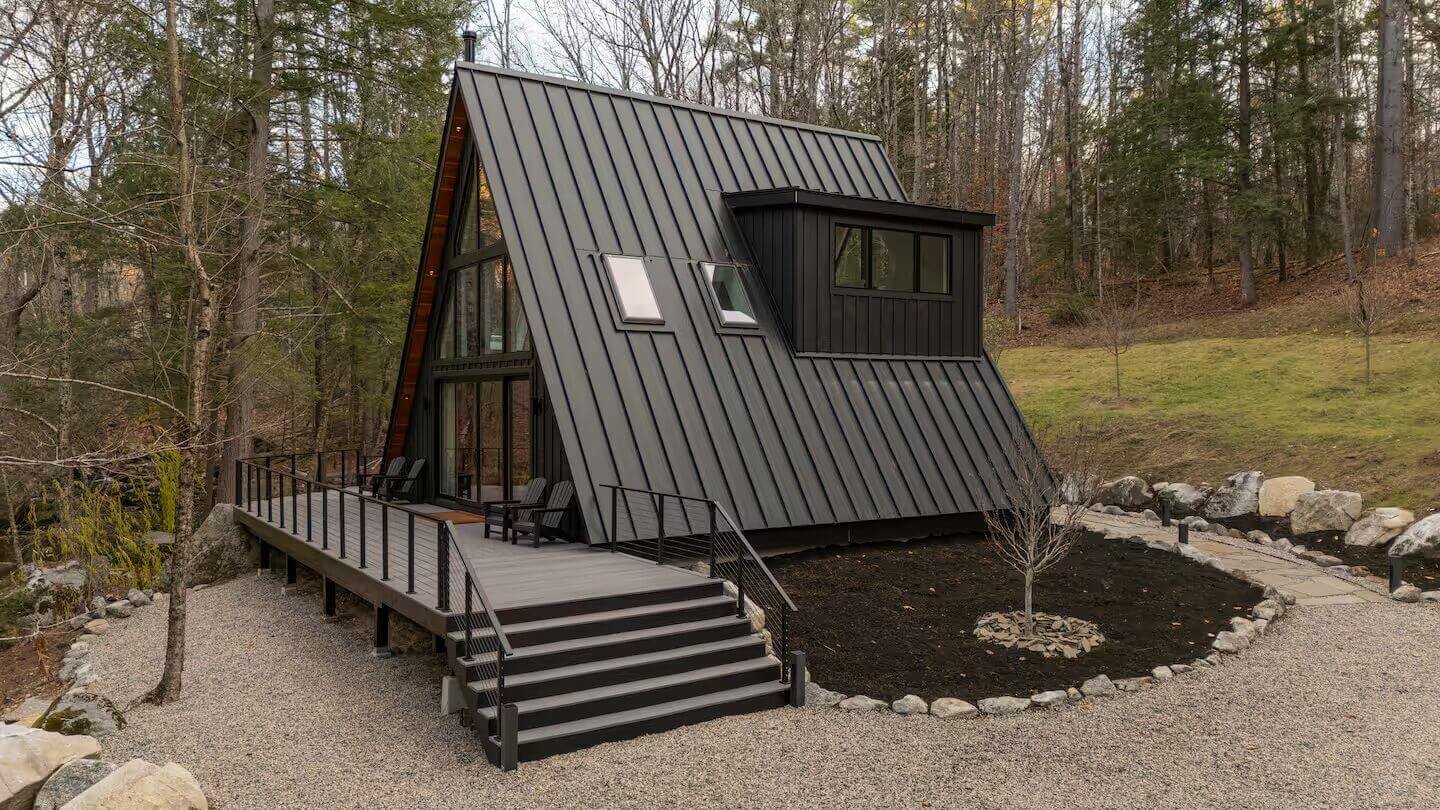 The ZEN A-Frame is a sanctuary nestled on a peaceful babbling brook that flows into Lake Winnipesaukee. It provides an experience of tranquility and thoughtful luxury.