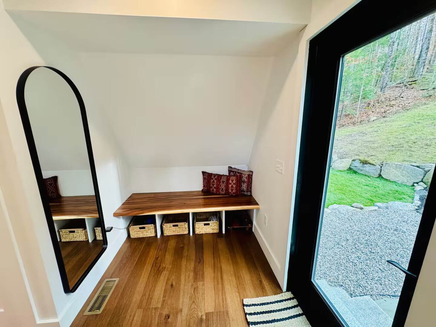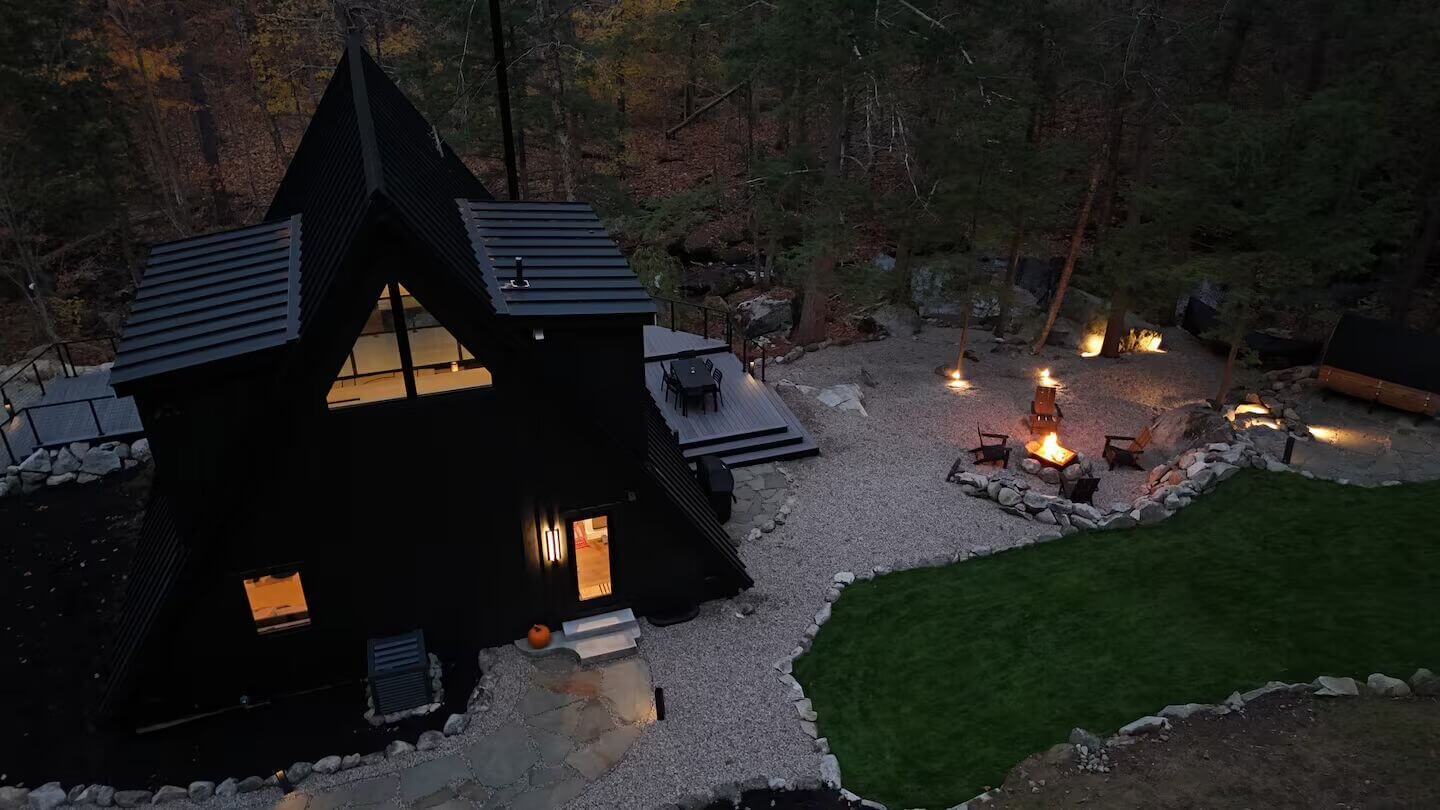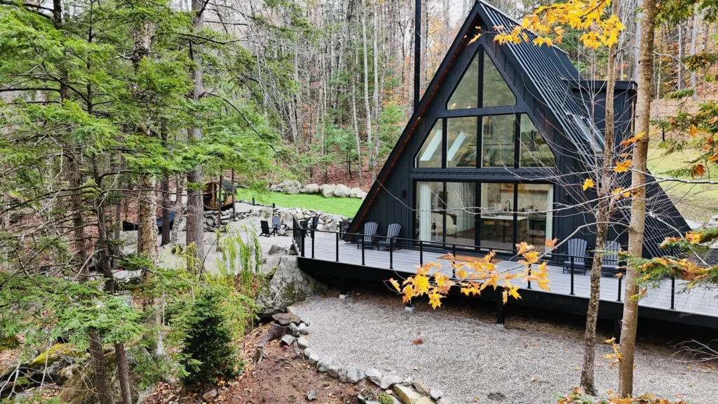 The ZEN A Frame is a peaceful retreat nestled beside a gentle babbling brook that flows toward Lake Winnipesaukee in New Hampshire’s scenic Lake Region. Surrounded by forest and natural beauty, the cabin offers a calm and thoughtfully designed space where guests can slow down, unwind, and reconnect with nature.