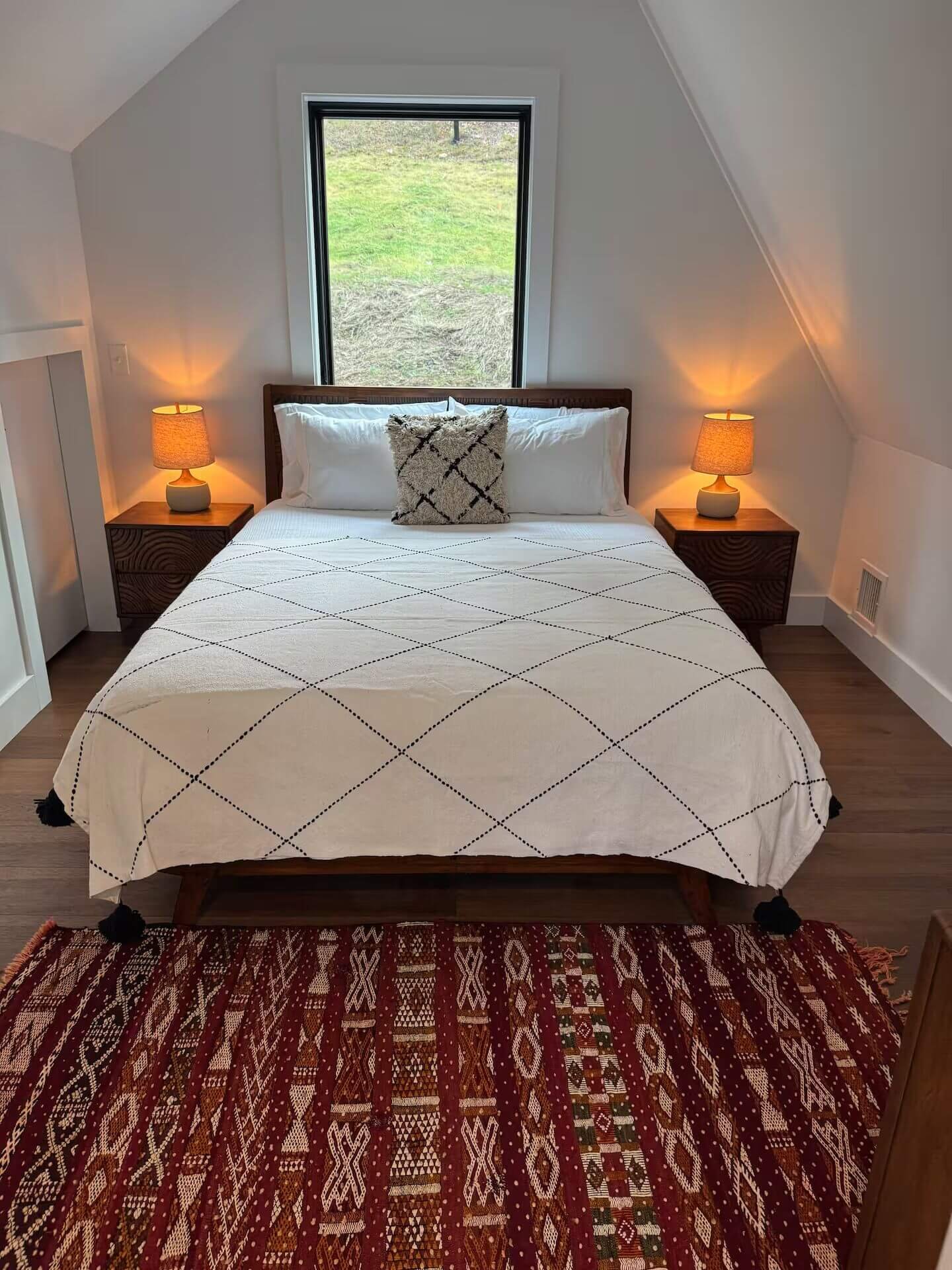 The cabin comfortably hosts up to four guests across two bedrooms. Each space is designed with comfort and simplicity in mind, offering a quiet place to unwind after a day exploring the Lake Region.
