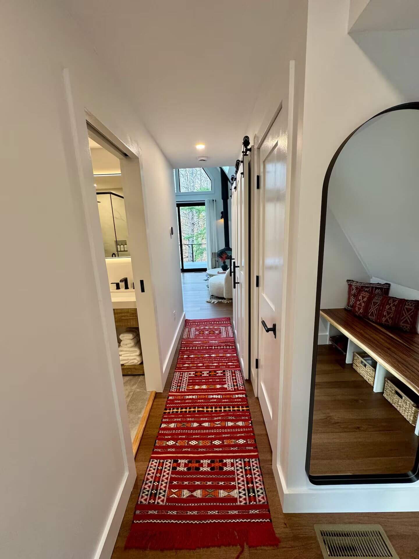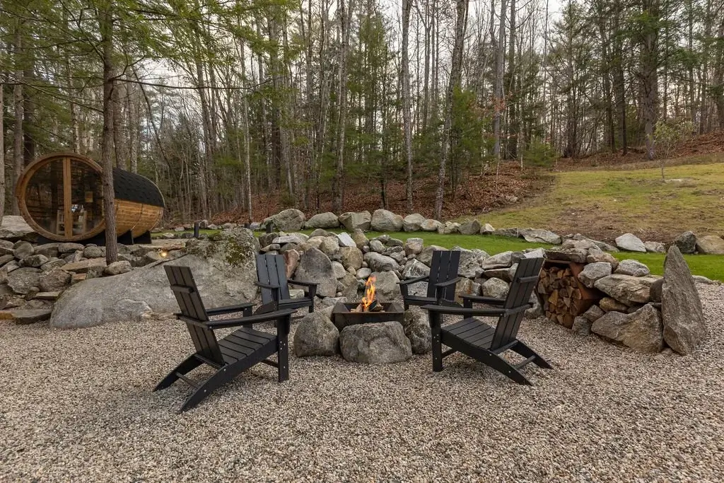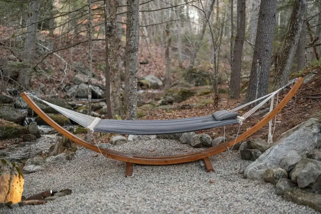 The outdoor spaces are just as inviting. Guests can enjoy the peaceful sounds of the nearby brook, spend time on the spacious deck, relax in the hammock, or gather around the fire pit under the stars.