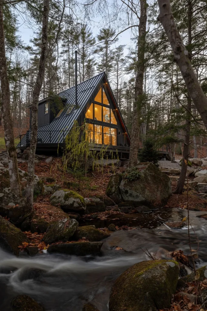 The cabin sits beside a gentle brook, creating a calm atmosphere with the soothing sound of flowing water.